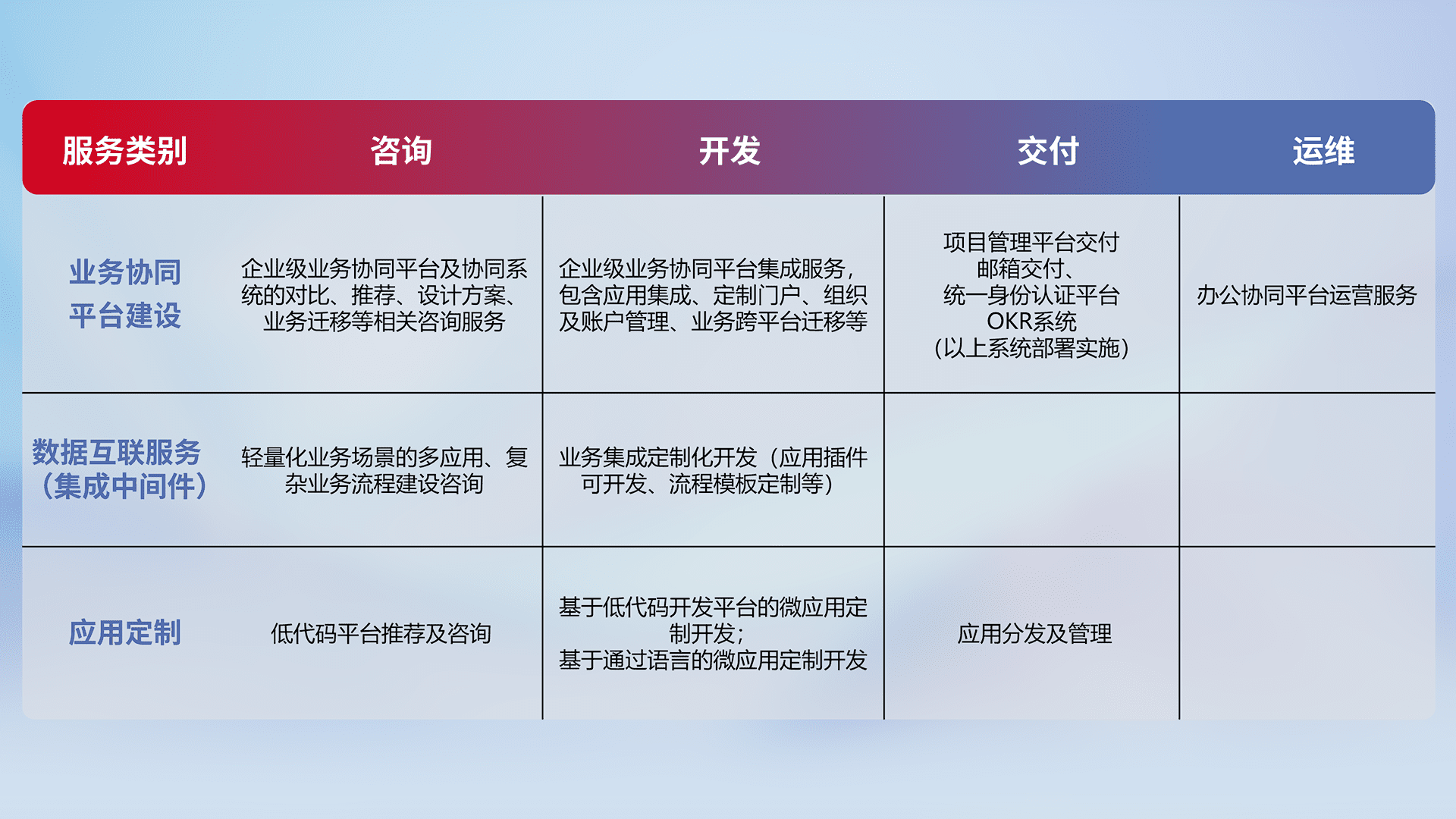 针对钉钉、、、企微、、IDaas等平台级产品提供产品的规划、、方案、、交付、、、、定制化开发等服务,,,实现如统一协同办公、、智能客户服务、、混合会议管理、、、智能数据查询、、等业务场景,,,实现数字化转型。。