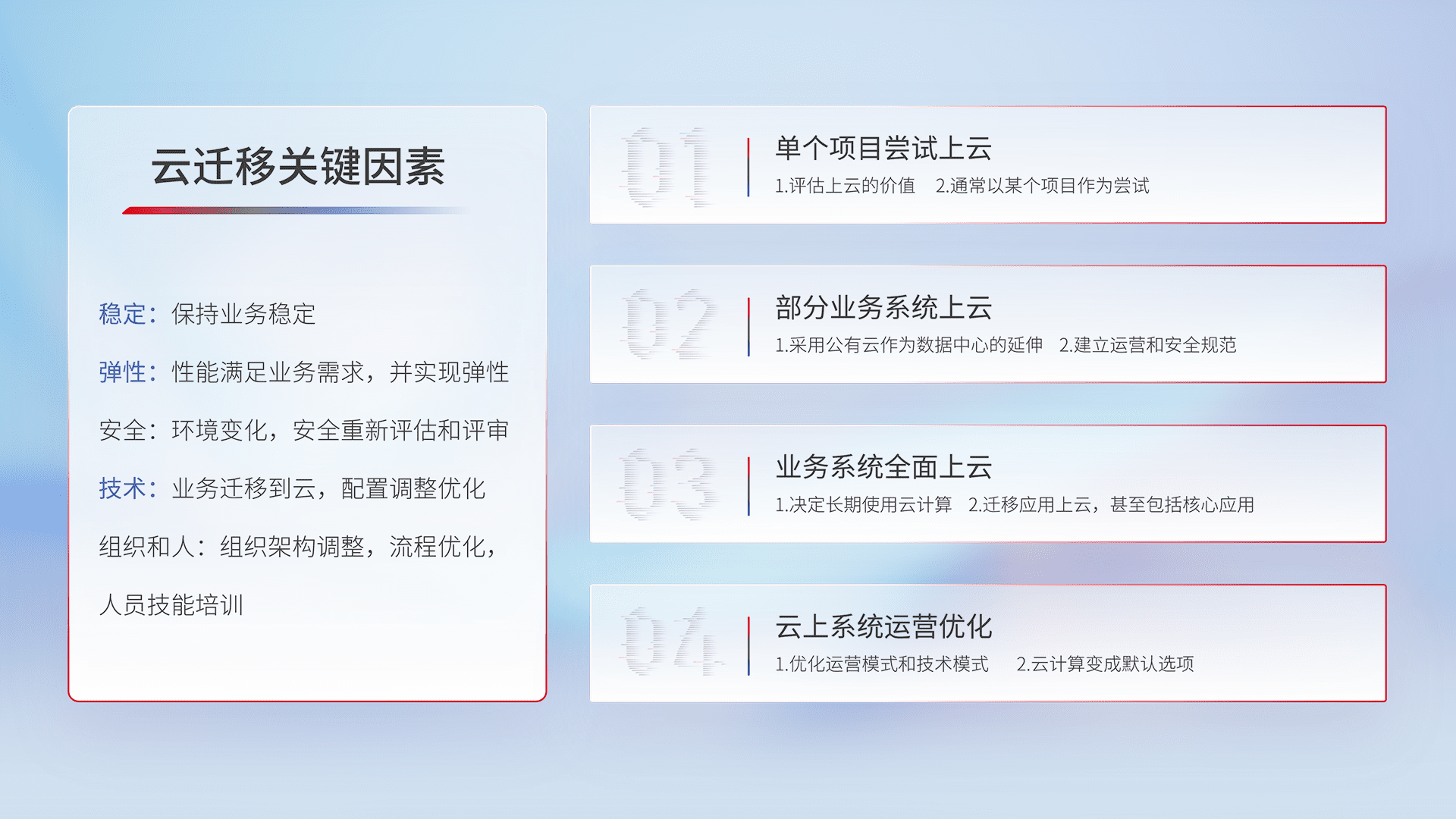 结合实际业务,,,从规划设计、、、云平台选型、、云原生改造、、数据迁移、、、、集成交付,,迁移全过程为客户识别最佳上云路径,,做好风险识别管理,,,设计网络架构、、、、身份权限、、、安全审计合规、、操作审计、、日志审计、、、监控告警策略、、多站点容灾设计等,,,对云上基础设施进行整体规划,,,提升IT治理水平,,,以满足弹性、、、高可用、、高性能的需求。。。。
