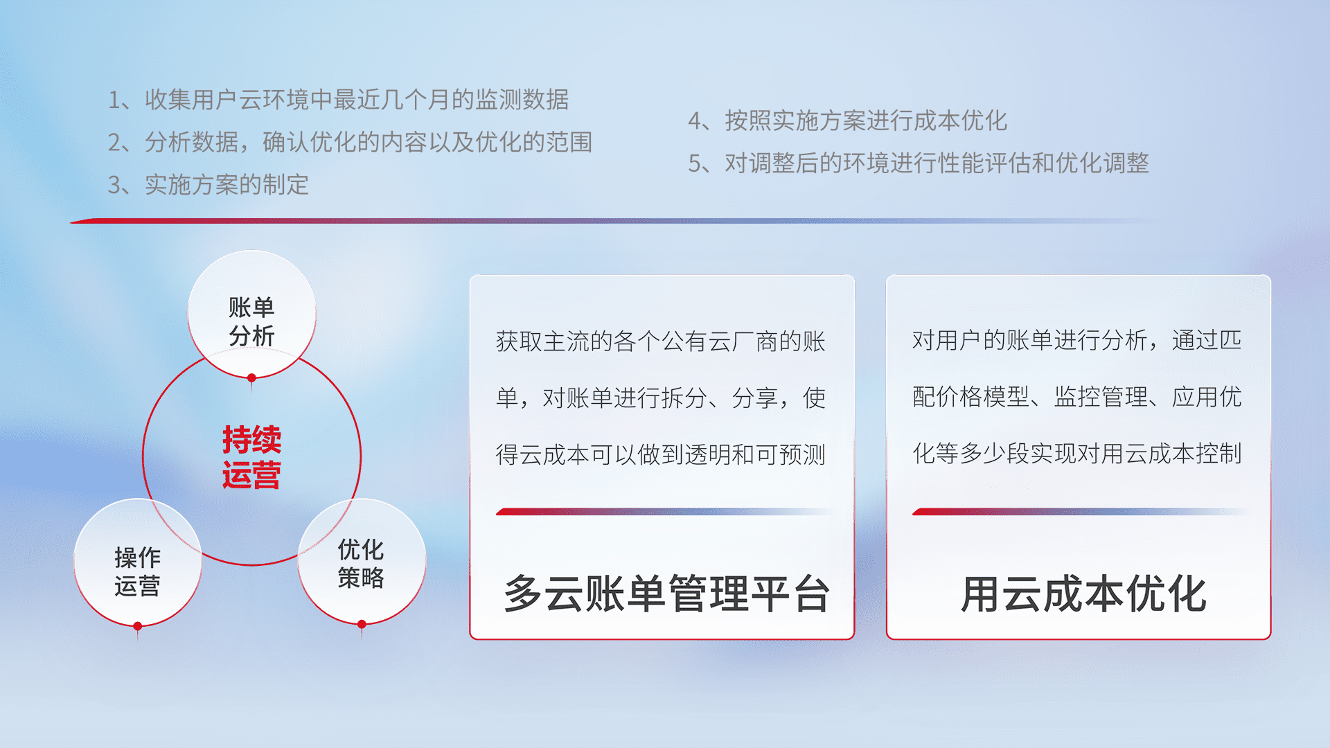 通过多云纳管,,以统一的资源数据模型把客户的云资源进行抽象和封装,,,,进而实现对多云资源的统一操作,,保障云资源管理的可靠性、、稳定性与可用性。。。。量身定制化运维内容,,配置、、、开发运维、、、、补丁管理、、、备份、、、监控、、、认证和访问管理、、审计和日常巡检等,,保障在用云过程中的可靠度,,,,稳定度以及高可用率。。。